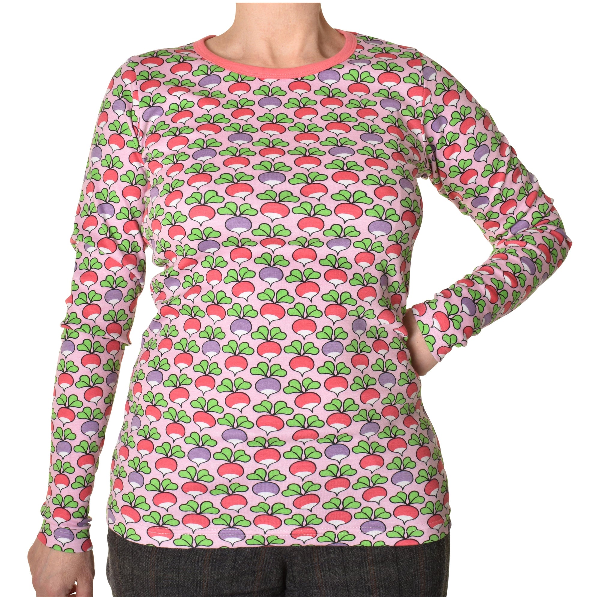 Soft, comfortable, long-sleeved top featuring a gorgeous radish print.