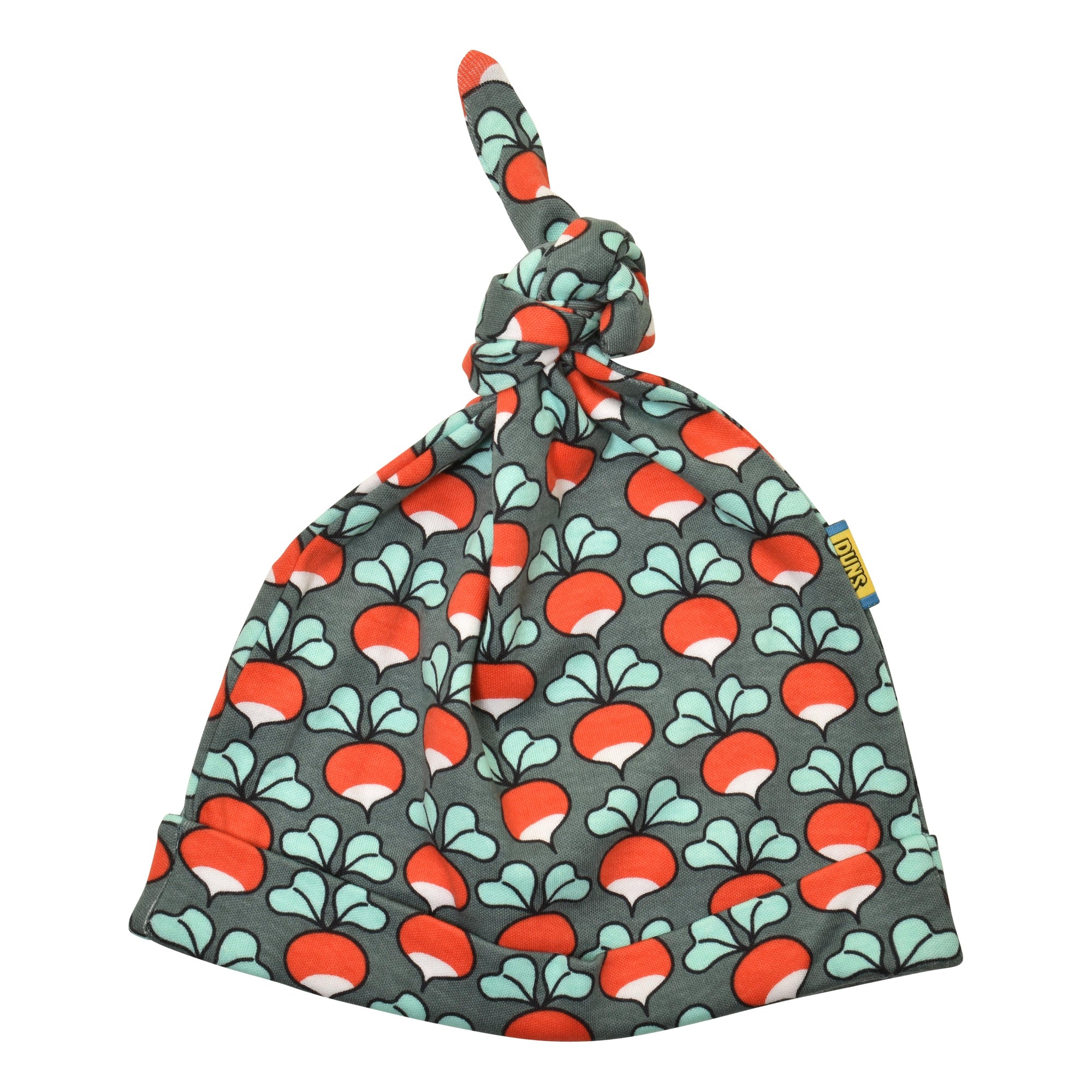 Single-layer knot hat with a fold-up edge in a classic radish print.