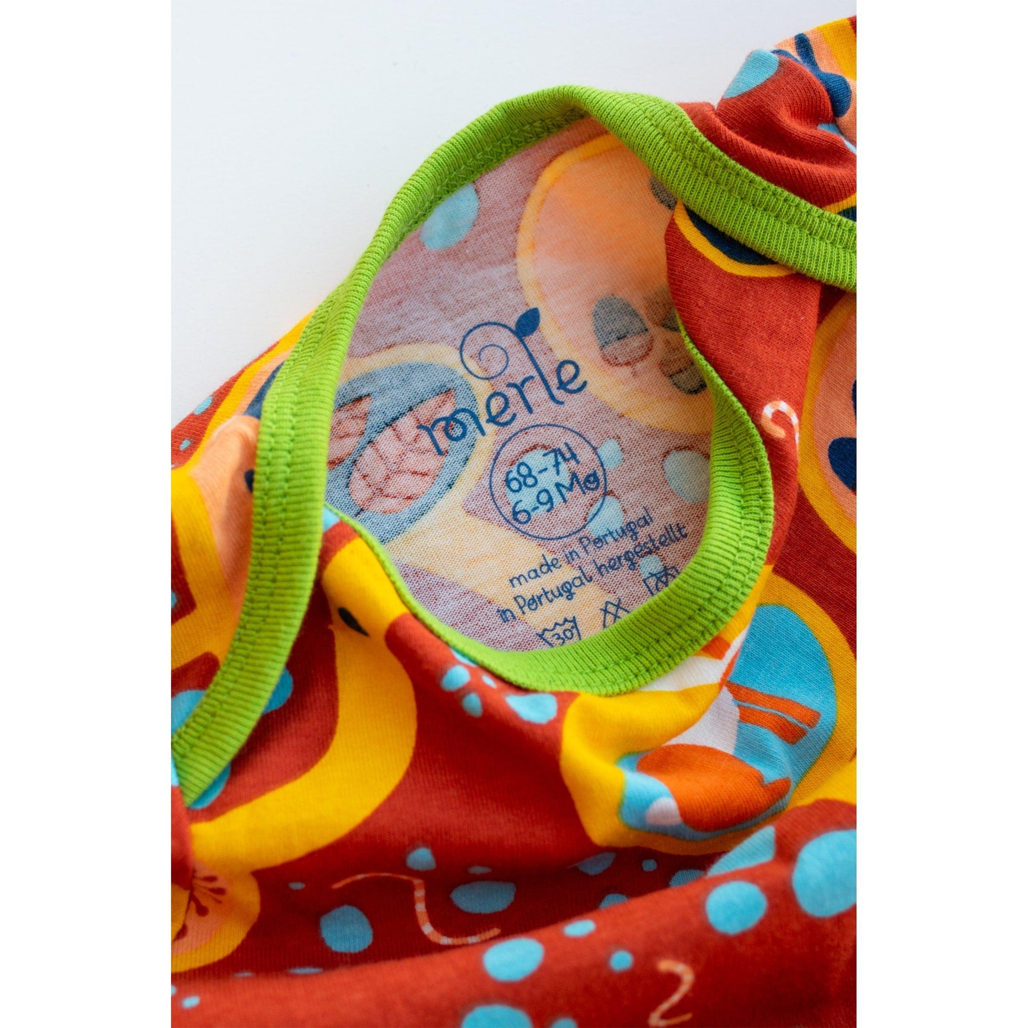 Short-sleeved body top made from soft cotton jersey featuring the fun Burrows print. Complementary green trim at neck and sleeves.